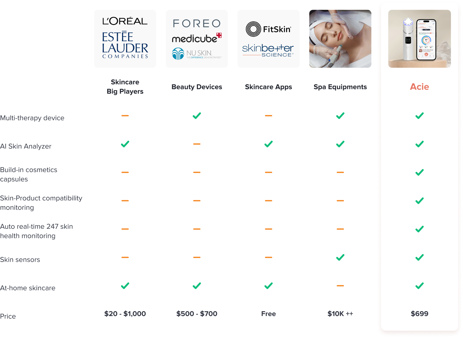 Acie™’s solution includes a smart all-in-one skincare device connected to a mobile app, powered by advanced AI and high precision bio-sensors. We are proud to hold 02 US Patents for our distinctive core technology, created by a talented team including 01 Postdoctoral scientist specializing in bio-sensors and skin diseases, 02 PhDs in AI, and a CES Innovation Award winner.
