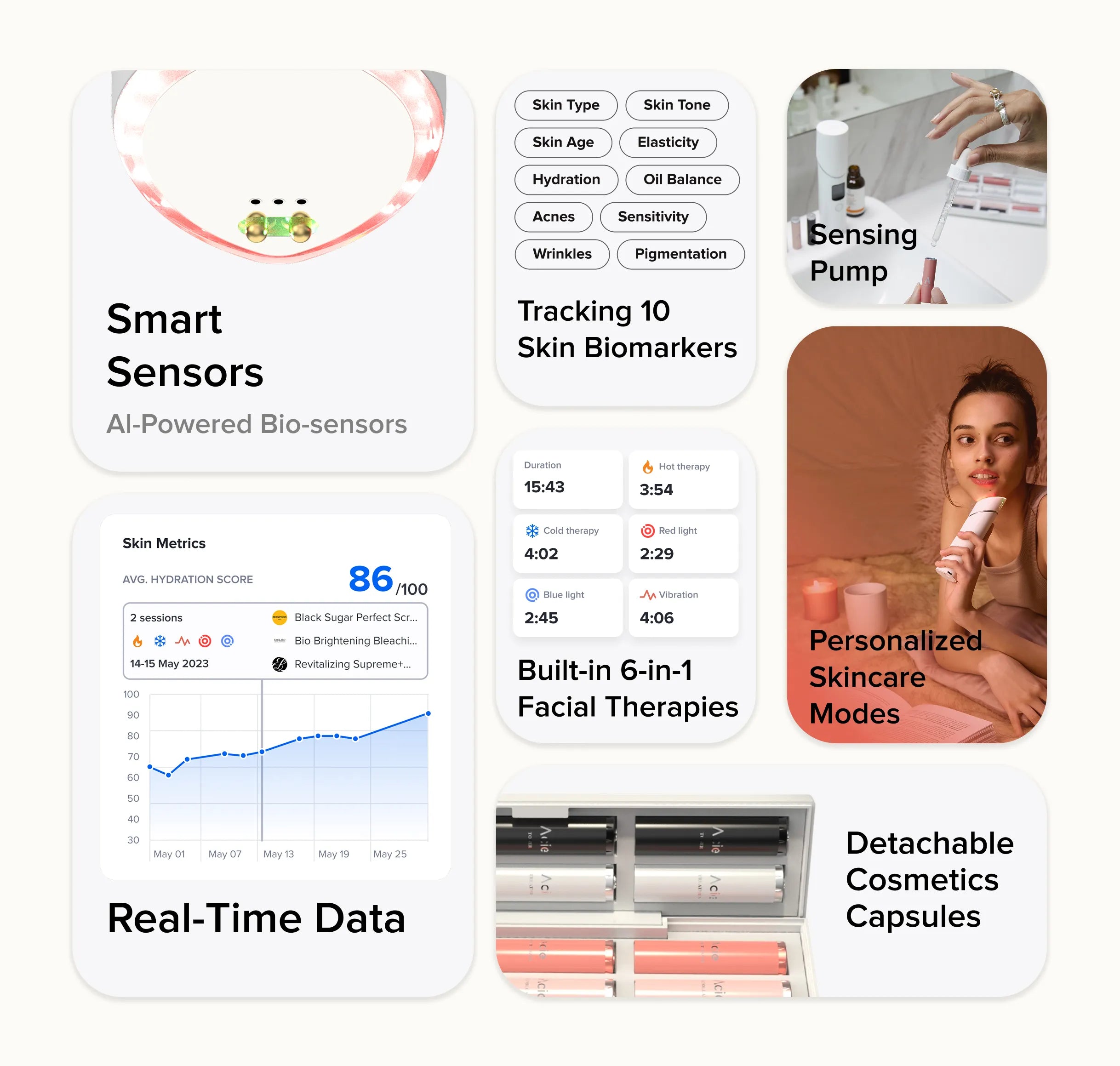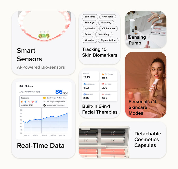 Our intelligent pump dispenses the perfect amount of product, tailored to your skin's needs. From simple to complex routines with 3 active capsules and 12 more in storage. Enjoy a seamless, no-mess application that lets you combine therapies without ever needing to wash your hands between steps.